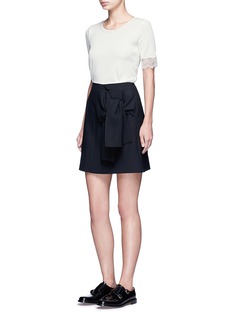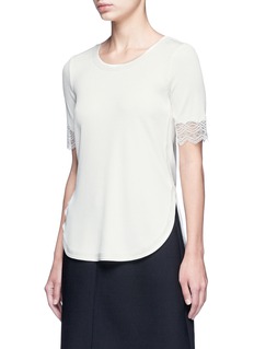 Playing out feminine elements with a distressed theme, 3.1 Phillip Lim sees to its forte in tactile elements with this ivory white rib knit T-shirt. Traced with raw strips of silk that seem to blend into the silhouette for contemporary charisma, this top is offset with lace cuffs to highlight a new type of styling alongside your skirts and denims.
