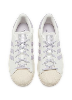 Step into soft elegance with these adidas Superstar sneakers, exquisitely crafted in a delicate lilac and white color palette. These shoes feature the iconic rubber shell toe and are enhanced with lilac stripes, adding a gentle pop of color. The soft leather upper and classic lace-up design ensure both comfort and style.