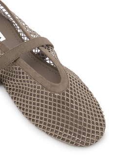 Step effortlessly into elegance with these Alaïa ballet flats, meticulously designed with a taupe snakeskin effect and delicate mesh detailing. These flats feature a pointed toe and a classic Mary Jane strap, accentuated with a polished buckle for a secure fit. The combination of exotic texture and timeless design makes these shoes a luxurious addition to any ensemble, offering both comfort and style