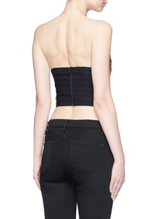 Dare to bare in this Saraphina cropped top from alice + olivia. Dressing up a simple bodice with rich embellishments in wooden, faceted, glossy and metallic beads, this bustier is an easy way to dress up your high-waisted looks with accessorised flair and fanciful baroque-meets-party notions.