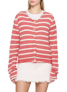 Indulge in the timeless charm of this BARRIE cardigan, expertly crafted from luxurious cashmere. Its classic red and white striped pattern exudes a playful yet elegant vibe, perfect for adding a pop of colour to your wardrobe. The cardigan features a round neckline and delicate button fastenings down the front, each detailed with a subtle scalloped trim that adds a unique touch.
