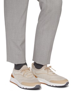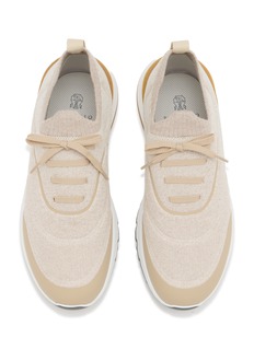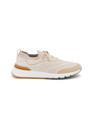 Inspired by the refined yarns of Brunello Cucinelli knitwear, these new techno cotton knit runners update the feel of classic styles in a contemporary way. The heat-sealed trim stands out next to the fine, comfortable appearance of the knit, creating an elegant texture contrast.