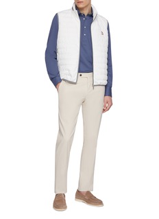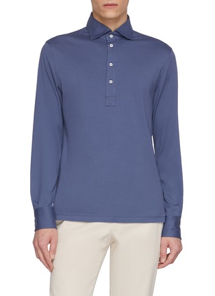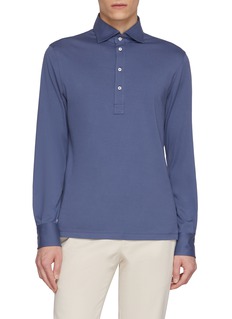 Elevate your leisurewear with this Brunello Cucinelli long-sleeve polo shirt. Rendered in a sophisticated slate blue, this piece is meticulously crafted from a luxurious cotton blend, offering both comfort and durability. The shirt features a classic polo collar with a three-button placket that adds a touch of refined detail. The slim fit design is perfect for creating a streamlined silhouette, making it an excellent choice for both casual and semi-formal settings.