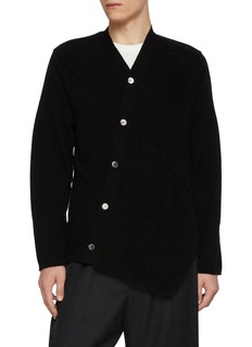Indulge in the avant-garde touch of COMME des GARÇONS Homme's black cardigan, crafted from a sumptuous wool mohair blend for ultimate comfort and warmth. This piece features a sleek asymmetrical button closure, adding a contemporary twist to the classic cardigan design, perfect for sophisticated layering.