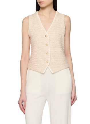 This Crush Collection vest exudes a soft, serene elegance perfect for layering in style. Crafted from a plush, textured knit in a delicate cream hue, it offers both comfort and chic sophistication. The deep V-neckline and golden button detailing add a touch of classic glamour, making it versatile enough to dress up or down. The sleeveless design allows for easy pairing with blouses or long sleeve tops, ideal for transitioning through seasons.