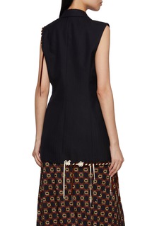 Dries Van Noten distills tailoring into an avant-garde gesture with this sleeveless blazer. Crafted from herringbone wool, it is punctuated by whipstitch lacing and contrast ties, bringing movement and subversive energy to a classic silhouette—perfect layered over flowing skirts or sharp trousers.