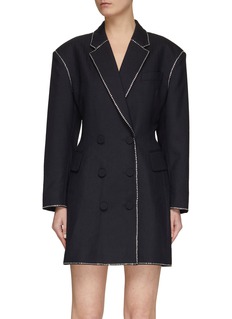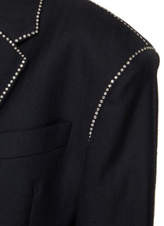 Dries Van Noten showcases this double-breasted blazer that features wide, padded shoulders and a sculpted waist to create a figure-flattering hourglass silhouette. Casted in black, the outerwear can be seen outlined with clear stones for a majestic finish.