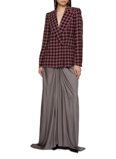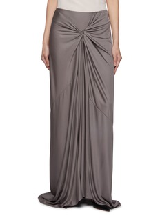 Fluid drapery defines this maxi skirt, crafted in slinky viscose that falls with liquid elegance. A gathered knot detail at the front introduces sculptural movement, capturing Dries Van Noten’s sensuous play of structure and softness for both day and evening.