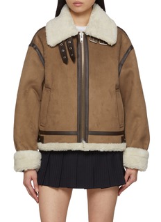 Evoking vintage aviator allure through a modern minimalist lens, this DUNST jacket is crafted from supple synthetic leather lined with plush shearling. The oversized silhouette and buckled throat latch deliver both warmth and attitude — perfect with mini skirts or structured denim.