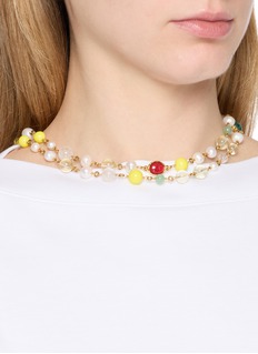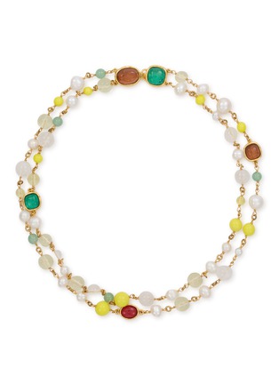 A celebration of light and movement, this Lagune double strand necklace by Goossens wraps the neckline in luminous rhythm. Rock crystal, freshwater pearls and aventurine intertwine across two delicate strands, designed to be worn reversible for versatile styling. Pair it with an off-shoulder dress or crisp shirting to evoke effortless summer elegance.