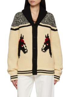 Embodying equestrian nostalgia, this Rodeo cardigan is crafted from a plush wool-cashmere blend in a heavy knit. Featuring bold horse intarsia motifs, a shawl collar and marled yoke detailing, it balances rustic warmth with statement artistry—perfect for countryside escapes or city layering.