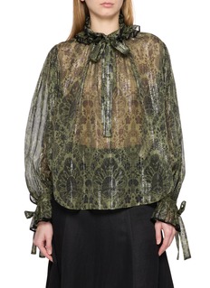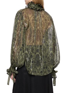 INTO THE EAST designs are rooted in Eastern philosophy, with a focus on effortless elegance and mindful craftsmanship. Rendered in an ornate pattern with a ruffled neck and tie closures, this top exudes an artisanal yet whimsical allure.