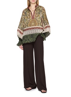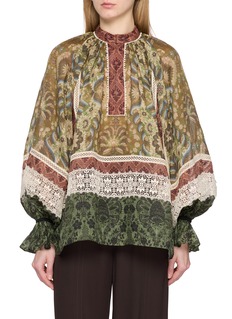 INTO THE EAST designs are rooted in Eastern philosophy, with a focus on effortless elegance and mindful craftsmanship. Rendered in alternating ornate patterns with contrast lace trims, this top exudes an artisanal yet whimsical allure.