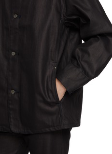This J∞QUALITY jacket combines rugged cotton canvas with the sophistication of a leather collar. Designed with snap button closure and a relaxed cut, it offers utilitarian ease elevated by subtle tailoring details—ideal for city layering or casual refinement.