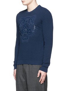 Roaring into view with the brand's signature feral motif in a parrot green rubberised print, this sweater from KENZO offers ultimate comfort and undeniable style in equal measure. Emboldening the tiger's iconic silhouette by way of a plain knit border for a shadowed impression, this cotton cover-up will command attention in any room.