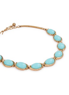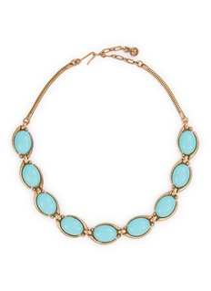 Embrace the sophisticated charm of 1950s Trifari through this exquisite necklace featuring luminous oval stones in lustrous settings. The elegant graduated design creates captivating visual flow, whilst the warm tones evoke Mediterranean summer elegance. This museum-quality piece represents Trifari's golden era of costume jewellery mastery.