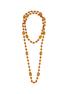 Embrace the warm sophistication of 1980s French luxury with this captivating long necklace that radiates golden elegance. The lustrous amber-toned stones create a mesmerising cascade of warmth, whilst the alternating rectangular and round stones add dynamic visual texture. A statement piece that transforms any ensemble into a celebration of vintage glamour.