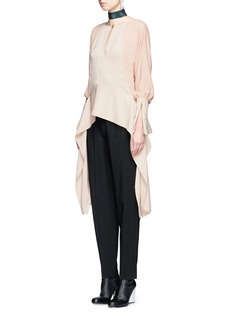 Accentuating feminine form with expert draping, this combo top from Lanvin is set to accent your sartorial separates with dynamic flutter. Adopting a two-tone contrast with silk crepe de Chine sleeves, this piece is fully animated with swift side trails to keep to a sophisticated flow.
