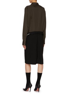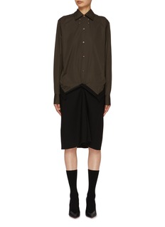 Discover the understated elegance of this Maison Margiela shirt dress, designed with sharp, minimalist lines that speak to the brand's avant-garde aesthetic. Crafted from luxurious, smooth fabric in a deep, versatile hue, this piece features a classic button-down front and a unique, artistic twist at the waist, making it a standout addition to any sophisticated wardrobe.
