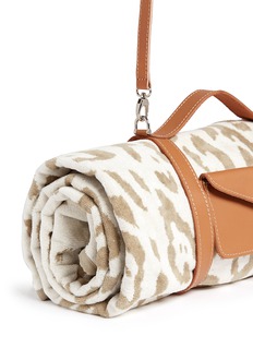 Easily accommodating two bathers, this Maslin beach towel looks right at home spread over the perfect beach spot or shady patch under a tree. Undeniably exotic in khaki green jaguar jacquard, this reversible number comes with a leather cross-body carrier, so you can instantly roll out a luxe locale at picnics and bonfires alike.