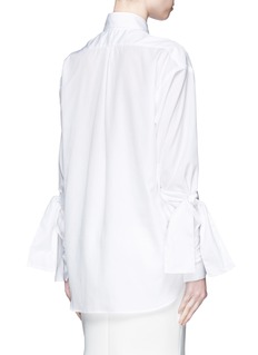 Reset the everyday mood with this unexpectedly faithful basic from Toni Maticevski. Purposely simple in classic tailoring, this crisp cotton poplin shirt takes a spin on sartorial details with a feminised approach, featuring sleeve bows for a ever-present sense of womanliness. Cut with a winged spread collar, wide cuff and high-low hem, this piece is a mixed gender style for the taking.