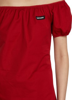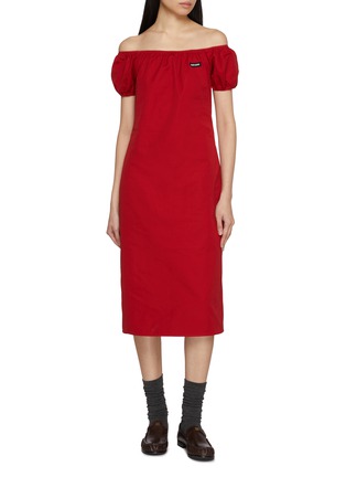Step into the spotlight with this vibrant red Miu Miu dress, a stunning example of the brand's flair for blending playful femininity with sophisticated style. The dress features an off-the-shoulder neckline with puffed sleeves, adding a romantic touch perfect for any occasion that calls for a sense of drama. Fabricated from a smooth, lightweight material, it offers both comfort and elegance, ensuring you move gracefully through any event. The streamlined silhouette punctuated by the label's signature logo adds a modern twist to this timeless piece.