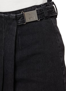 The pleated front panel defines these MO & Co. denim shorts. Detailed with a logo-appliquéd metallic buckle, the pair is designed with a raw hem for added texture.