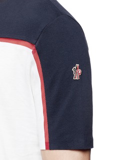 Showcasing an ingenious hybrid of fabrics in a basic silhouette, this Moncler Grenoble tee features navy cotton piqué and red mesh colourblocks set against a versatile white jersey base. Exuding a vigorous vibe, this simple piece will make a convenient go-to for off-duty styling.