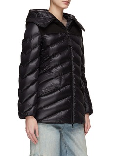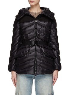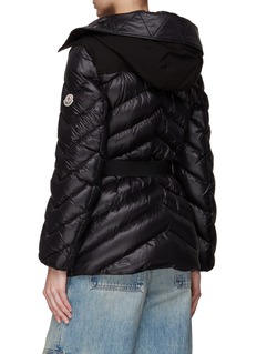Moncler presents this jacket, equipped with a belt to cinch the waist for a more elegant ambiance. Executed in a classic puffer fashion and adorned with a logo charm on the zipper, this jacket unifies playfulness and timeless balance.