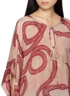 Natalie Martin’s Paulina caftan embodies the label’s breezy elegance through its flowing silhouette and bold hand-dyed motif. Crafted from lightweight fabric, it features a tie-detail neckline, fluid sleeves, and side slits — perfect for layering over swimwear or styling as a statement top.