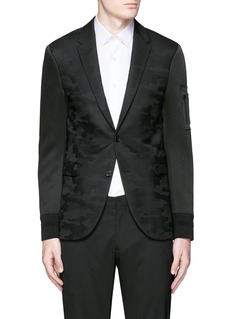 Lending a utilitarian punch to classic suiting silhouettes, Neil Barrett blends business and pleasure with this blazer. Cloaked in camouflage jacquard to mark the brand's trademark contemporary wit, this cover-up is framed by satin sleeves and ribbed cuffs to restore sportive balance to your after-dark sets.