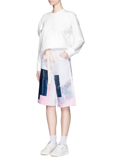 Display tropical inspirations in Nicopanda's street-punk manner with these cotton twill long shorts. Decking out its artisanal imagination with hand-printed plastisol and glitter patchwork panels, this pair is tied with a satin ribbon tie at the double waistband for an atypical princess-esque twist.