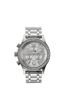 Hailing from the lineage of a contemporary classic design, Nixon's 38-20 Chrono scales down to a diameter of 38mm from its predecessor's 42mm, making it slimmer, sleeker yet as inherently elegant as its family pedigree. Inlaid with Swarovski crystals around the bezel and equipped with 3 sub-dials, this dazzling timepiece is an expressive fashion statement with stellar functionality.