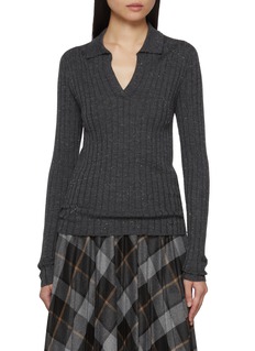 Knitted from a fine viscose and wool blend with shimmering laminated specks, this Peserico top redefines everyday sophistication. Its ribbed texture contours the silhouette, while the polo collar and V neckline add a touch of casual polish—perfect for layered or solo wear.