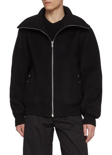 A sharp exploration of form and function, this Rick Owens jacket in melton wool features the house’s signature exaggerated dracucollar that folds dramatically across the neckline. Padded for structure yet cut with ease, it moves between outerwear and statement piece—ideal for layering with minimal tailoring or monochrome separates.