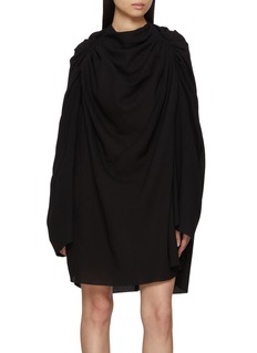 Expressing fluid architecture through form, this Rick Owens dress features sculptural draping and gathered shoulders that frame the silhouette in motion. Cut from Italian wool sablé, its supple texture and convertible sleeve design echo the label’s devotion to avant-garde elegance.