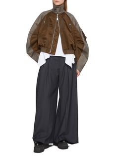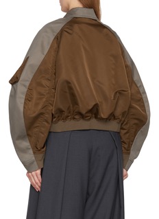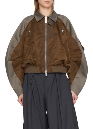 This sacai bomber jacket exemplifies a masterful blend of utility and contemporary style, featuring a bicolour palette for a utilitarian flair. Crafted in a relaxed fit, it includes a convertible collar and side pockets, enhancing both functionality and aesthetic appeal.