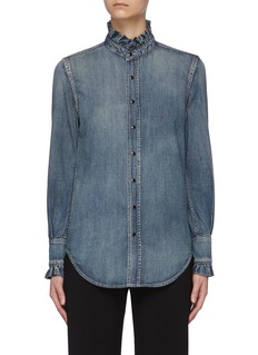 Boasting a wash denim veneer and ruffled trims, this SAINT LAURENT shirt is an assemblage of grunge and elegance. Executed in a boxy silhouette, this piece styles perfectly with your downtown separates to create enticing ensembles.