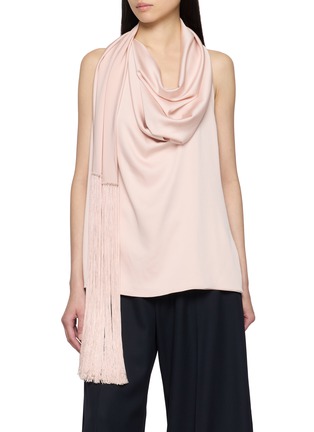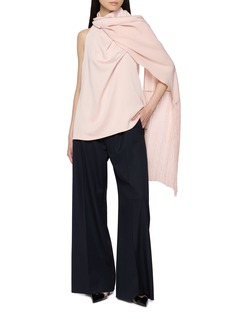 Sharon Wauchob’s Meslay top flows gently over the neck, revealing soft movement through its cascading drape. Designed with a feminine pink hue and complete with a fringed edge, it brings a whisper of romance to fluid tailoring or evening silhouettes.