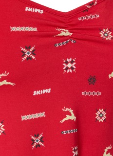 Feels like a dream. Designed with a triangle neckline and flirty ruching at the centre front, this festive print set is adorned with frilly lettuce edge details at the cami and short hem. Includes an elastic underband and adjustable straps for support and comfort.