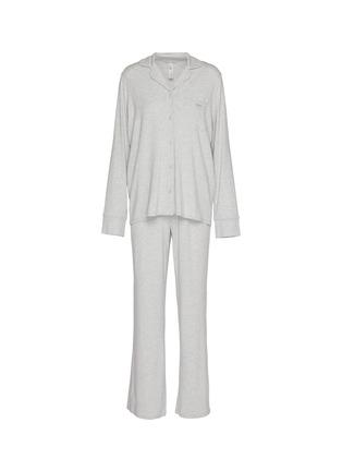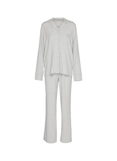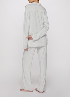 Your old pajamas can’t compete with this soft, ultra-comfortable sleep set. Features a slightly oversized button-up top with long sleeves, a chest pocket, and piping details. The straight leg pants have a relaxed fit and a stretchy waistband with an adjustable interior drawstring.