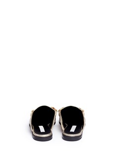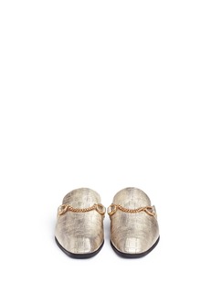 Enveloped in a shimmering gold hue, these faux crocodile Tanka slide loafers by English designer Stella McCartney put a modern, eco-friendly spin on the timeless loafer. Composed in non-animal materials, this cruelty-free pair ensures the ultimate in comfort with a low stacked heel and a cushioned insole.