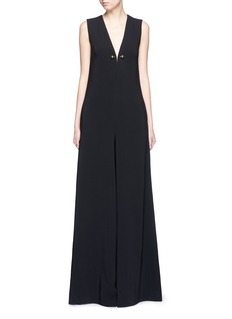 Channelling its signature masculine vs. feminine aesthetic, this crepe jumpsuit from Stella McCartney makes for a fluid formalwear addition to your minimalist wardrobe. Stepping up evening appeal with a detachable brass brooch bar that secures a sensual plunge neckline, it is gracefully finished with wide flared legs to enhance an elongated silhouette.