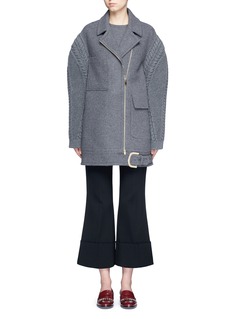 Defined by its hybrid collision of materials, this Stella McCartney coat unexpectedly mixes fine felted wool blend with tactile cable knit. Saturated in an autumn-ready grey hue and designed with boyish oversized sleeves, this outerwear softly defines your frame with its belted hem.