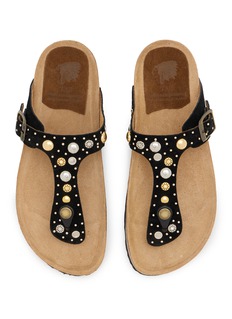 TAJI's thong sandal merges bohemian flair with contoured comfort through studded embellishments, an adjustable buckle strap, and cork-effect footbed. The casual silhouette features decorative hardware detailing, a cushioned anatomical insole, and durable rubber sole for effortless everyday style. A laid-back essential that balances artisanal edge with relaxed wearability.