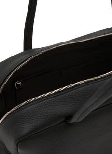 Experience the essence of refined simplicity with The Row's black leather handbag. This elegantly designed piece boasts a structured rectangular silhouette, crafted from smooth, supple leather that speaks to the brand's dedication to quality. The bag's compact yet spacious interior offers ample room for essentials, making it an ideal choice for both professional settings and evening events. The slender, elongated handles provide a comfortable grip, enhancing its sleek and functional appeal.