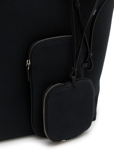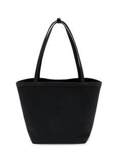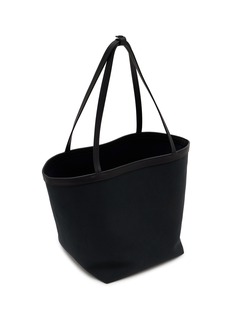The Row's Park Tote Three showcases a distinctive wide top that gracefully tapers to a narrower base, creating an elegant, trapezoidal silhouette that combines both form and function. This unique shape allows for ample storage space, making it an ideal choice for those who value both minimalist style and practicality in their accessories.