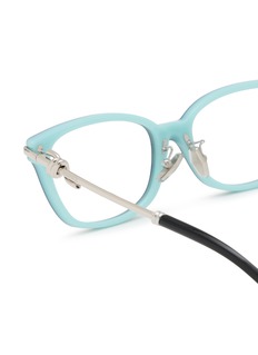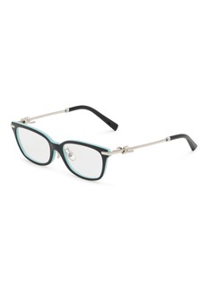 Step into a vision of modern elegance with these Tiffany & Co. eyeglasses. They feature a distinctive black and Tiffany blue frame, accented with sleek silver hardware for a touch of refinement. The sophisticated design is completed with adjustable nose pads, ensuring a comfortable fit for all-day wear. Perfect for those seeking to add a hint of luxury to their everyday style, these glasses blend functionality with iconic aesthetics, making them a superb choice for fashion-savvy individuals.