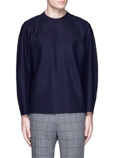 Combining relaxed Japanese tailoring with the comfort of wool felt, Tomorrowland presents this navy sweater for convenient layering. Purposely ribbed at the shoulder to bring out this piece's drop shoulder silhouette, this pullover will team perfectly with your favourite tailored pants.