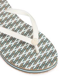 Resort style just got a whole lot cooler with these Thin flip flops from Tory Burch. A straightforward essential detailed with a gold-tone medallion at the thong strap and a geometric printed footbed, this pair is effortlessly chic for the beach and beyond.